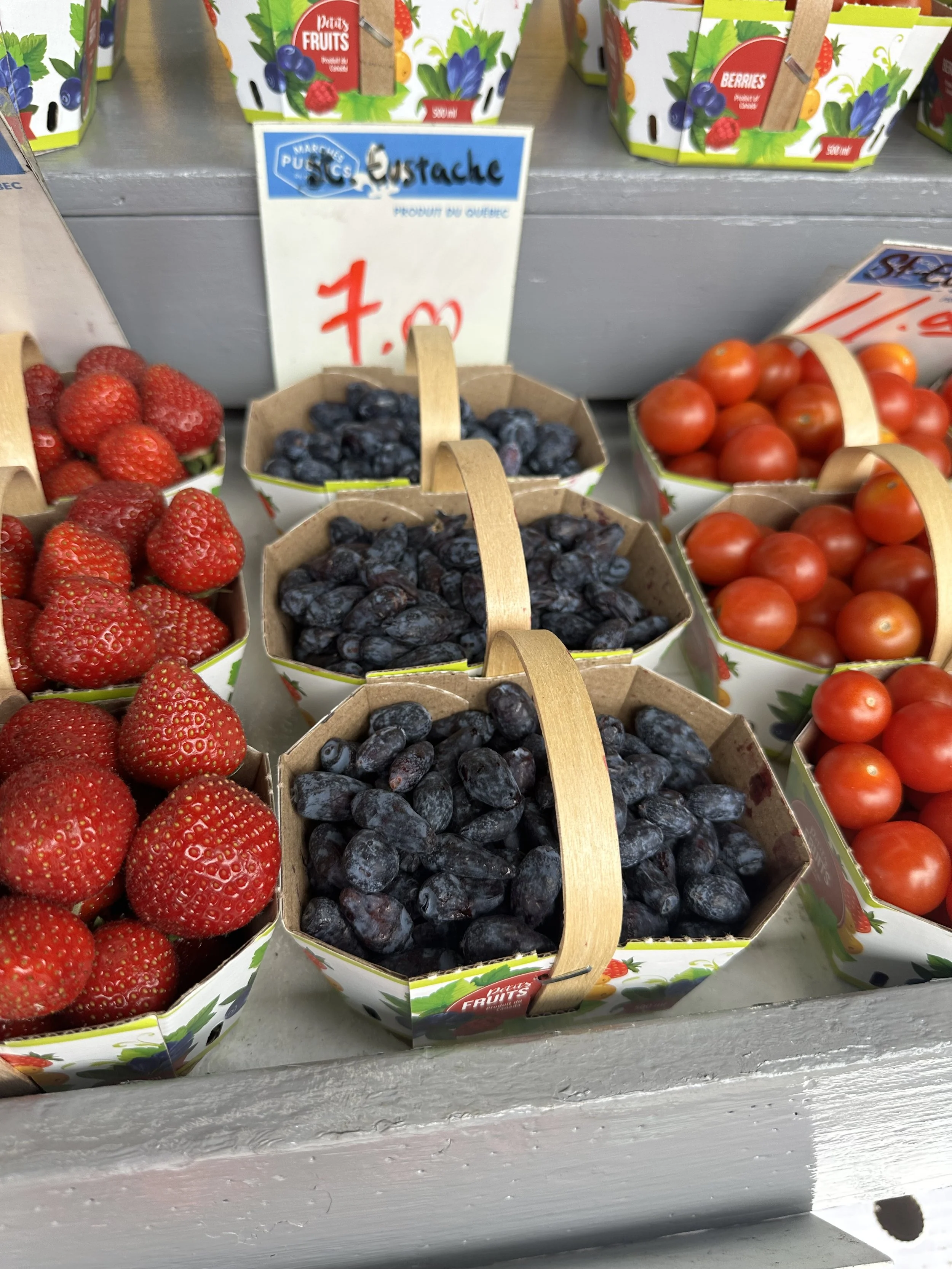 Exploring the Jean Talon Market with a professional chef was a wonderful learning experience! We purchased these Haskap berries, which were described as a cross between a grape and a blue berry, and then later in the day, used them to create a dessert topping for a very light, creamy cheese, similar to a brie. Delicious!